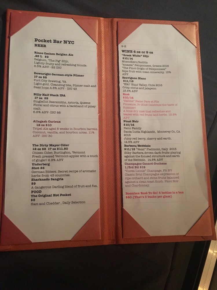 Pocket Bar NYC, located at 455 W 48th St in New York, offers a range of unique beverages and a cozy atmosphere perfect for a night out with friends. The bar welcomes walk-ins and takes reservations, making it convenient for any occasion. With options for outdoor seating and a casual dress code, Pocket Bar NYC is a great spot to unwind and enjoy a drink. They specialize in beer, wine, and artisan fortified wines, such as Allagash Curieux and Bodegas Albero. The Aperol Glitz is a must-try frozen cocktail that adds a fun twist to a classic drink. Whether you're looking to relax with a glass of Champagne or try a bold BarberaNebbiolo blend, Pocket Bar NYC is the place to be for a laid-back evening.